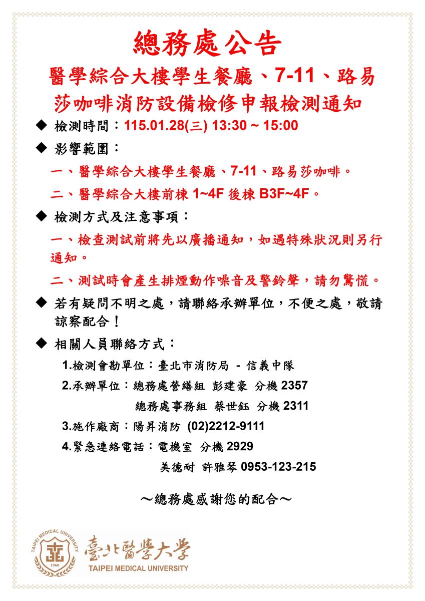 【總務處公告】115年01月28日「醫學綜合大樓學生餐廳、7-11、路易莎咖啡消防設備檢修申報檢測」通知