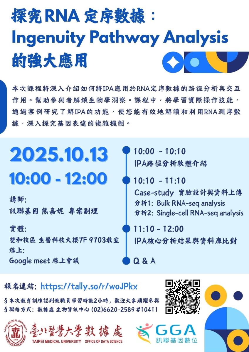 本次課程將介紹如何將IPA應用於RNA定序數據的路徑分析。深入介紹如何利用IPA進行路徑分析與交互作用。幫助參與者解鎖生物學洞察。課程中,參與者將學習實際操作技能,並通過案例研究了解IPA的功能,未來,您將可以利用這樣的關鍵知識和實用工具更有效地解讀和利用RNA定序數據。深入探究基因表達的複雜機制。