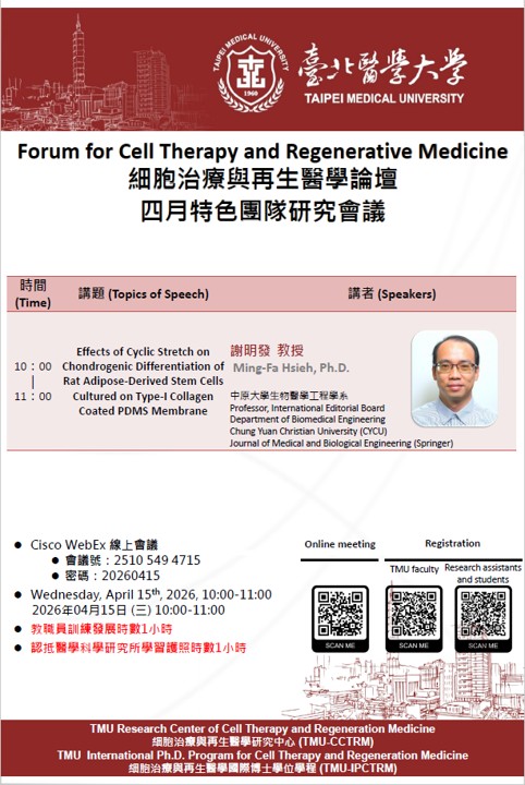 四月份細胞治療與再生醫學特色團隊研究論壇